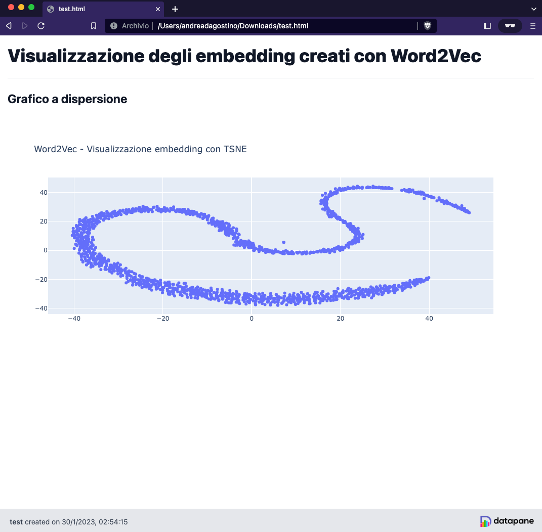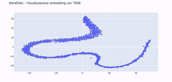 - Usiamo TSNE e Plotly per visualizzare gli embedding comprendere visivamente lo spazio vettoriale generato da Word2Vec