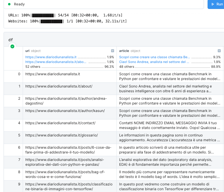 - Eseguiamo lo script per scaricare i dati dal nostro blog target (in questo caso useremo proprio Diario Di Un Analista)