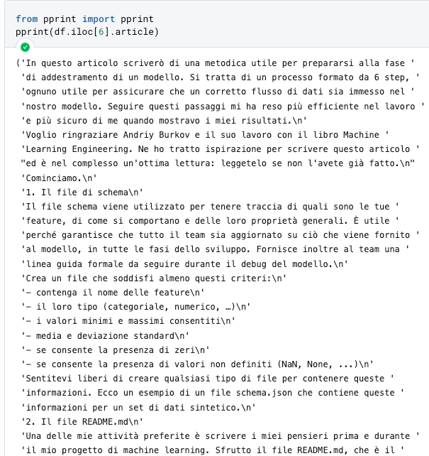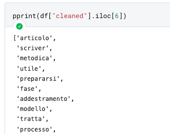 Vediamo come questo debba essere processato prima di essere consegnato al modello Word2Vec. Dobbiamo andare a rimuovere le stopword italiane, pulire da punteggiatura, numeri e altri simboli. Questo sarà il prossimo step.