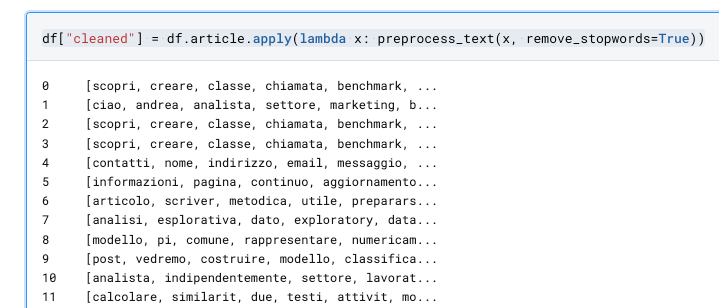 df["cleaned"] = df.article.apply(lambda x: preprocess_text(x, remove_stopwords=True))Otteniamo una serie pulita.