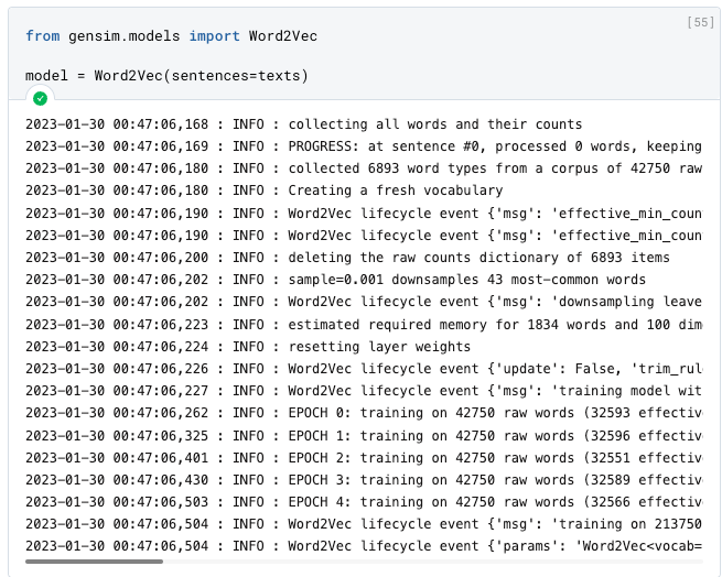 new_model = Word2Vec(sentences=texts, vector_size=VECTOR_SIZE, min_count=MIN_COUNT, sg=SG)