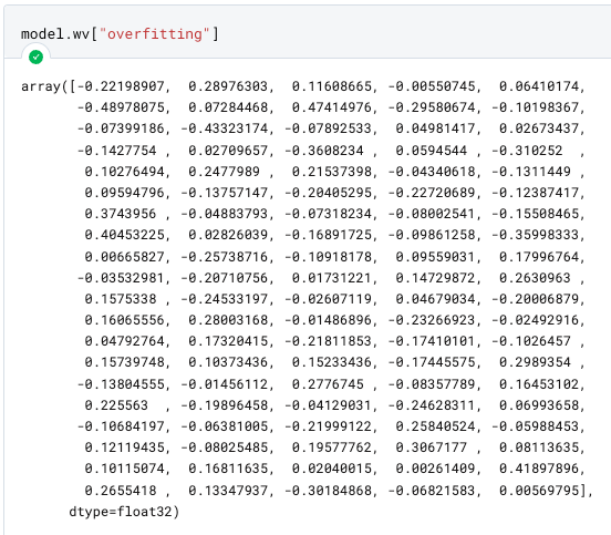 Il nostro modello è pronto e gli embedding sono stati creati. Per verificarlo, proviamo a trovare il vettore per la parola overfitting.