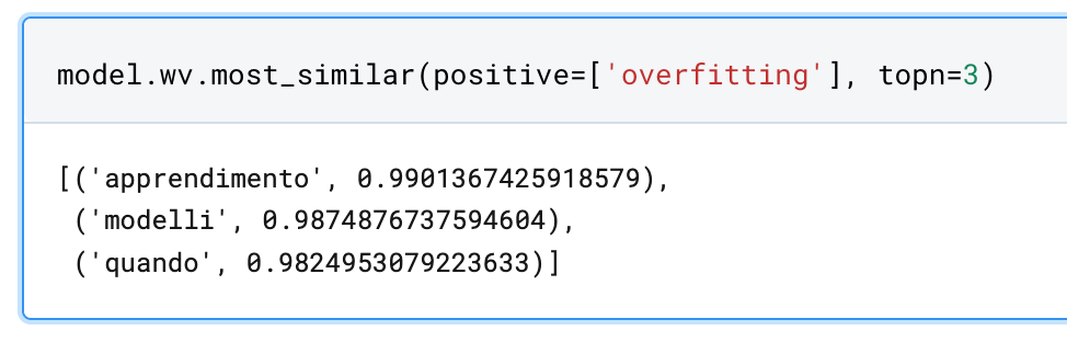 Con il comando di seguito istruiamo Gensim a trovare le prime 3 parole più simili a overfitting