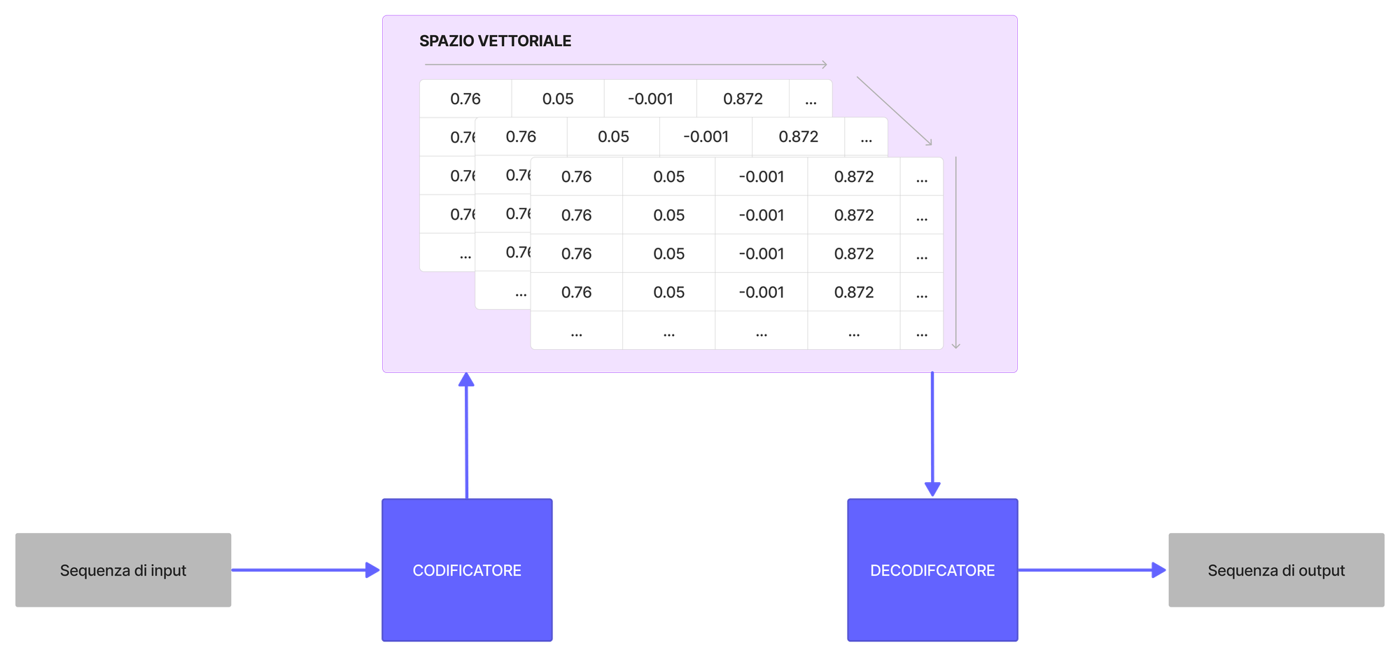 L'encoder prende la sequenza di input e la mappa in uno spazio dimensionale superiore (vettore n-dimensionale). Quel vettore astratto viene immesso nel decodificatore che lo trasforma in una sequenza di output. La sequenza di output può essere in un'altra lingua, simboli, una copia dell'input, ecc.