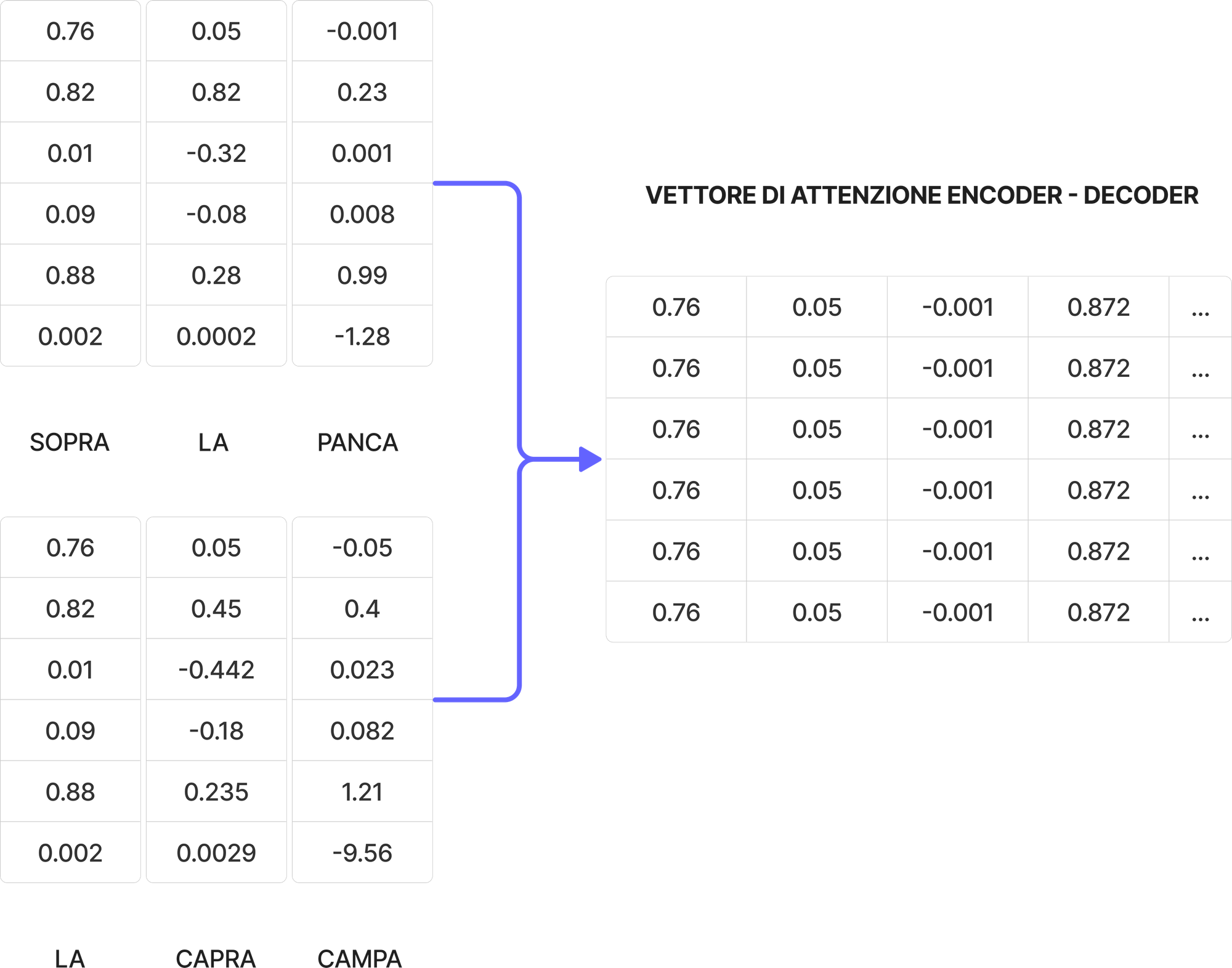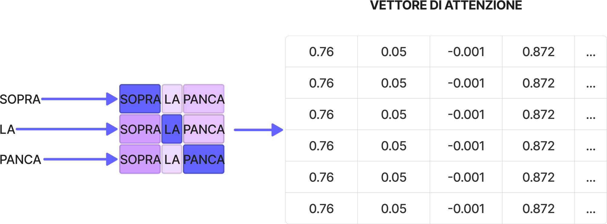 Il meccanismo di attenzione crea in output un vettore di attenzione per ogni parola all'interno della frase.