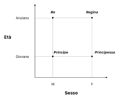 Questa rappresentazione riesce a catturare lo status nobiliare di un individuo andando a usare le dimensioni di genere e l’età.