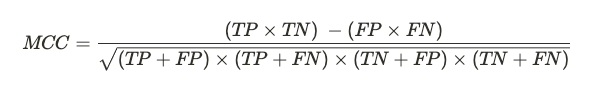 Sembra uno scioglilingua, ma in realtà questa formula si comporta come un coefficiente di correlazione. Essa va quindi da +1 a -1. Un valore che tende a +1 misura la qualità delle predizioni del nostro classificatore anche in contesti con classi sbilanciate nel dataset, poiché indica una correlazione tra valori reali osservati e previsioni fatte dal nostro modello.